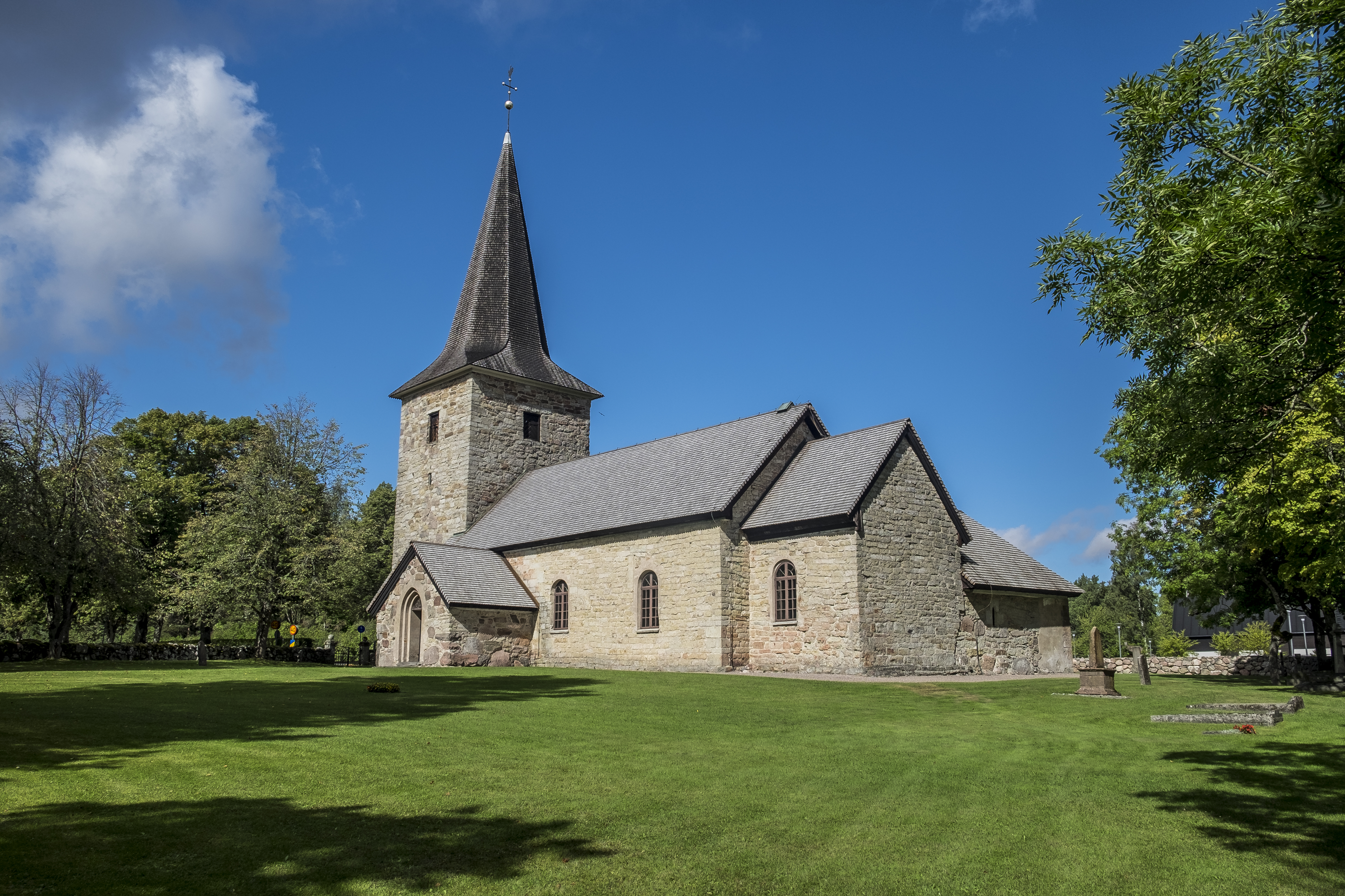 En kyrka med gott om bevarade kyrkliga kulturskatter och en runsten inmurad i väggen! En hög och smal spira, typisk för Kållands kyrkor, utmärker den på långt håll och byggnadssättet med stenar i olika storlek och färg med murbruk emellan – gör att åtminstone jag tycker den ser lite annorlunda (och vacker) ut.
