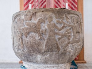 Dopfunten med vackra reliefer, Norra Härene kyrka