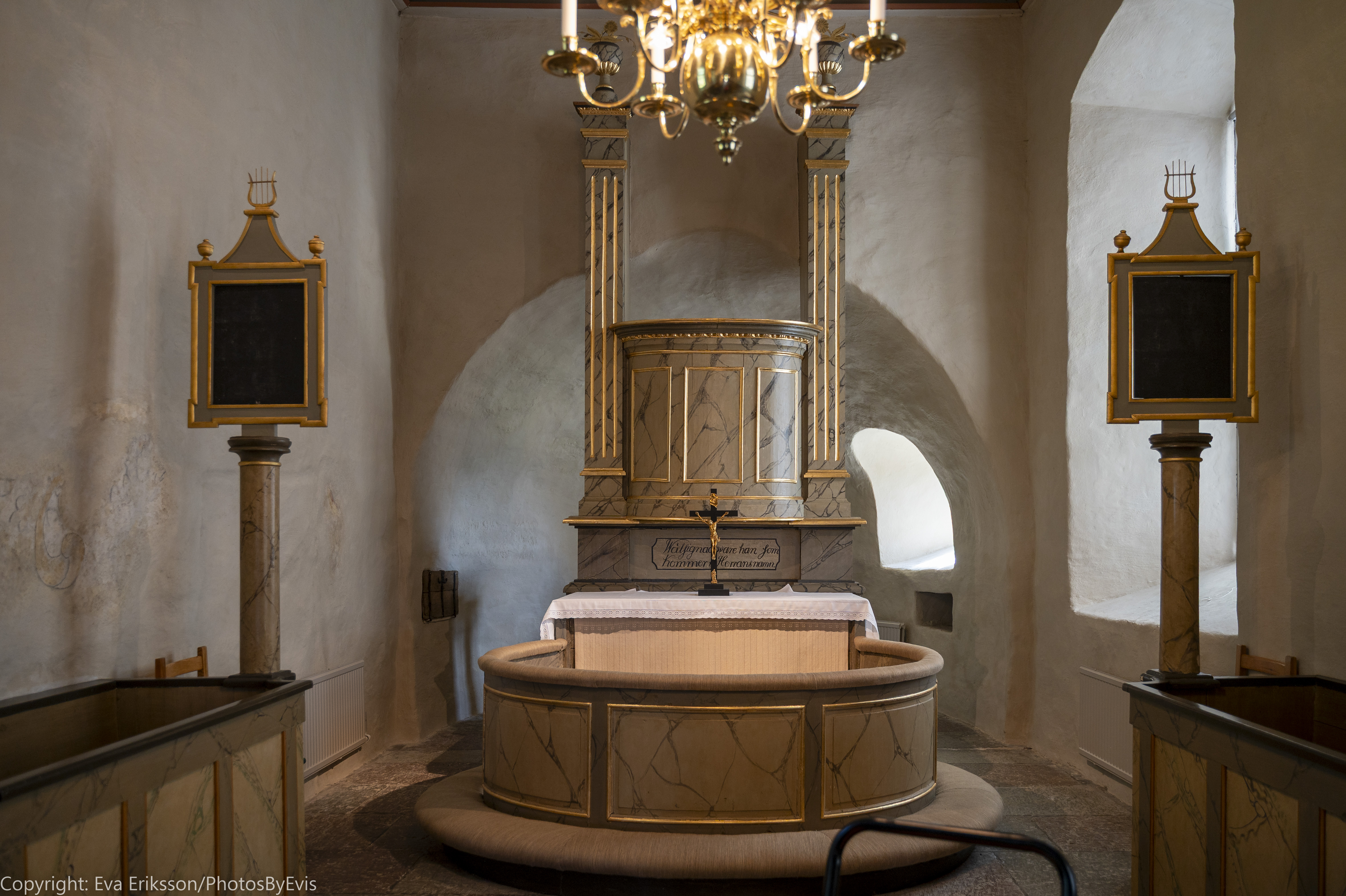 Nummertavlorna i koret är från 1700-talet. De gluggar man kan se i absiden hade man för att förvara altarkärlen i.