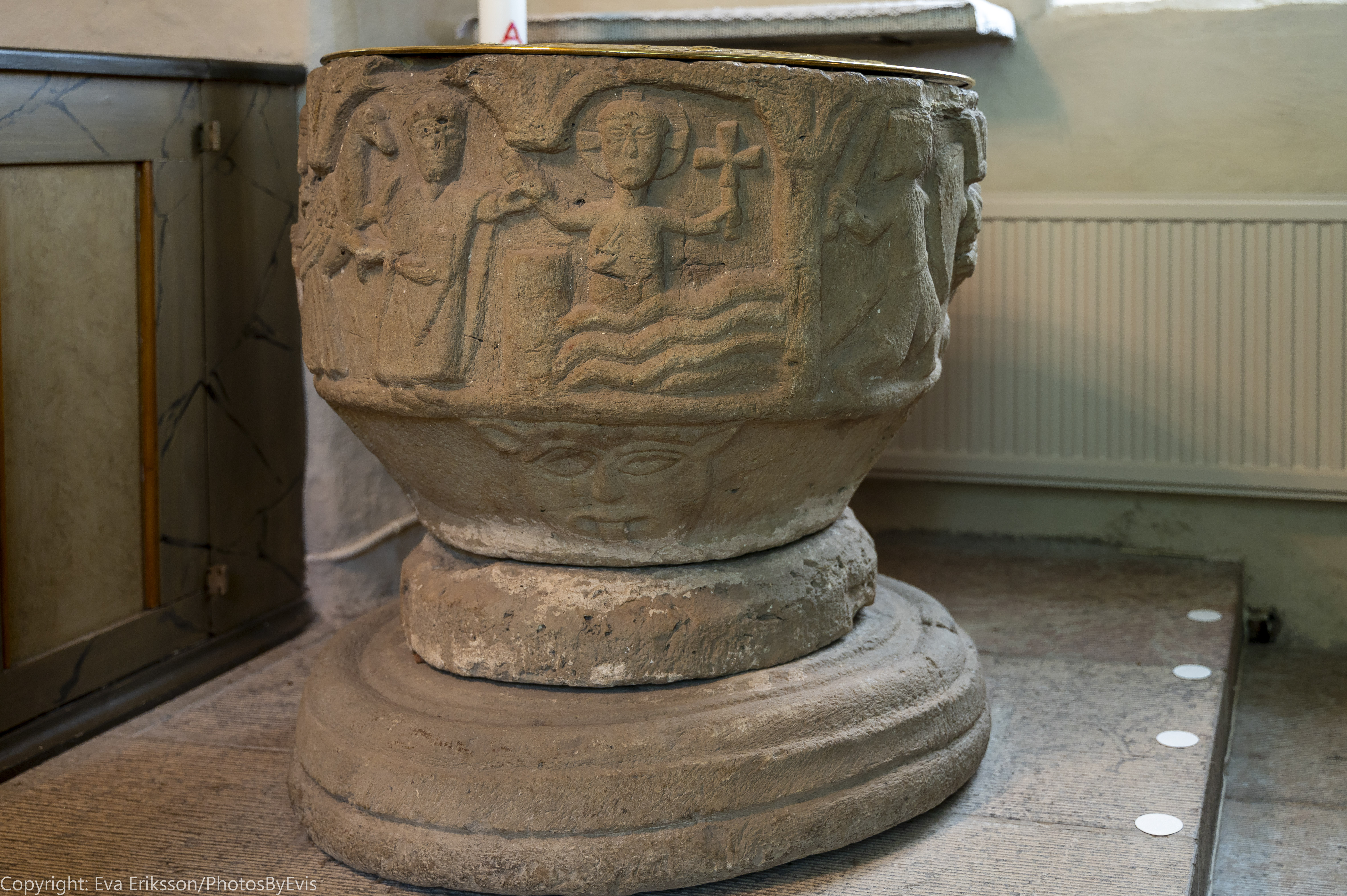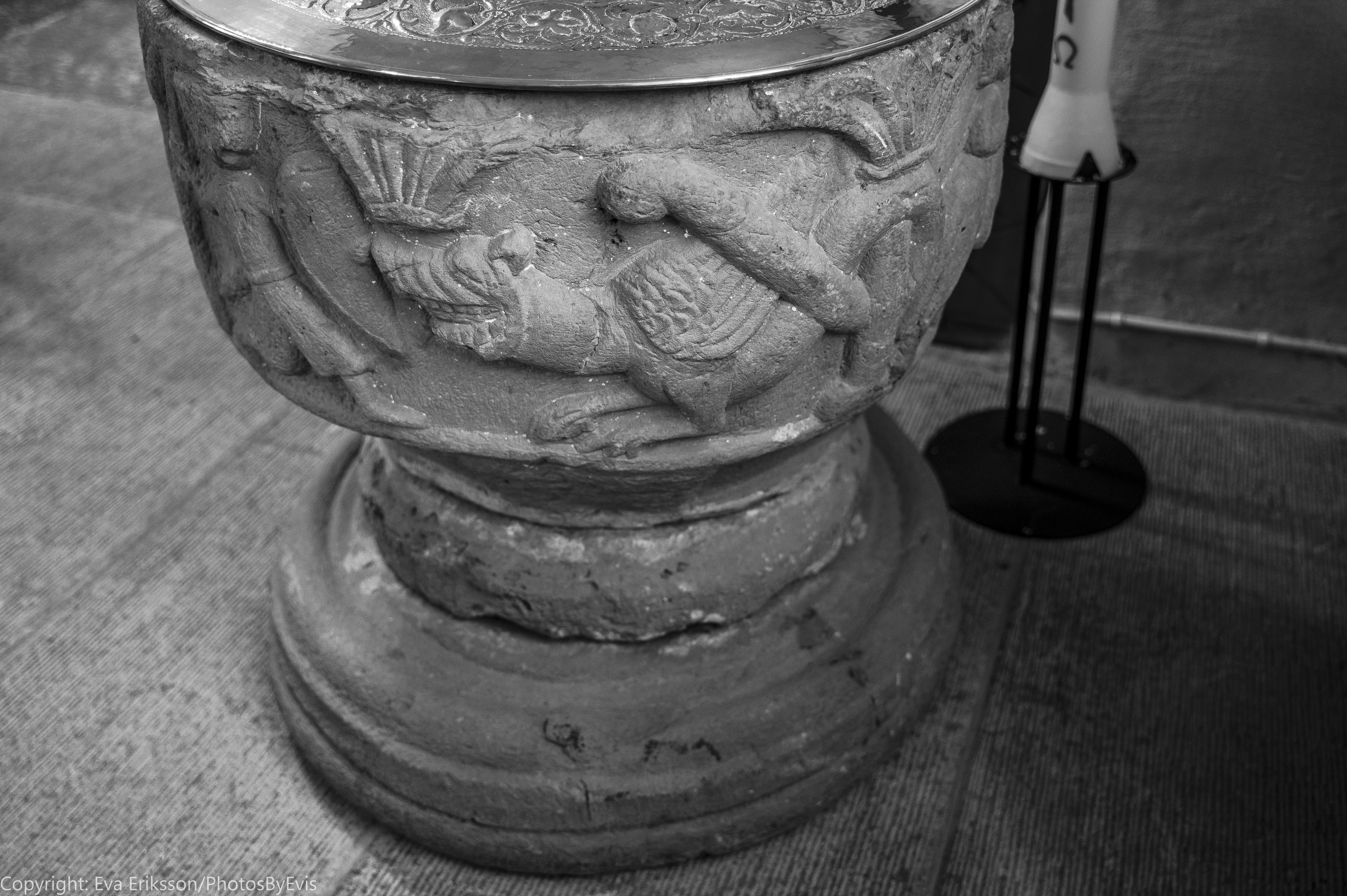 Figur 1 och 2 symboliserar troligtvis kristendomens seger över hedendomen. Figurerna i 3 och 4 avser sannolikt en präst som döper en person men anfalls av onda makter för att hindra honom. En ängel eller god ande ingriper och hejdar den onde. Figur 5 symboliserar strid mellan gott och ont.