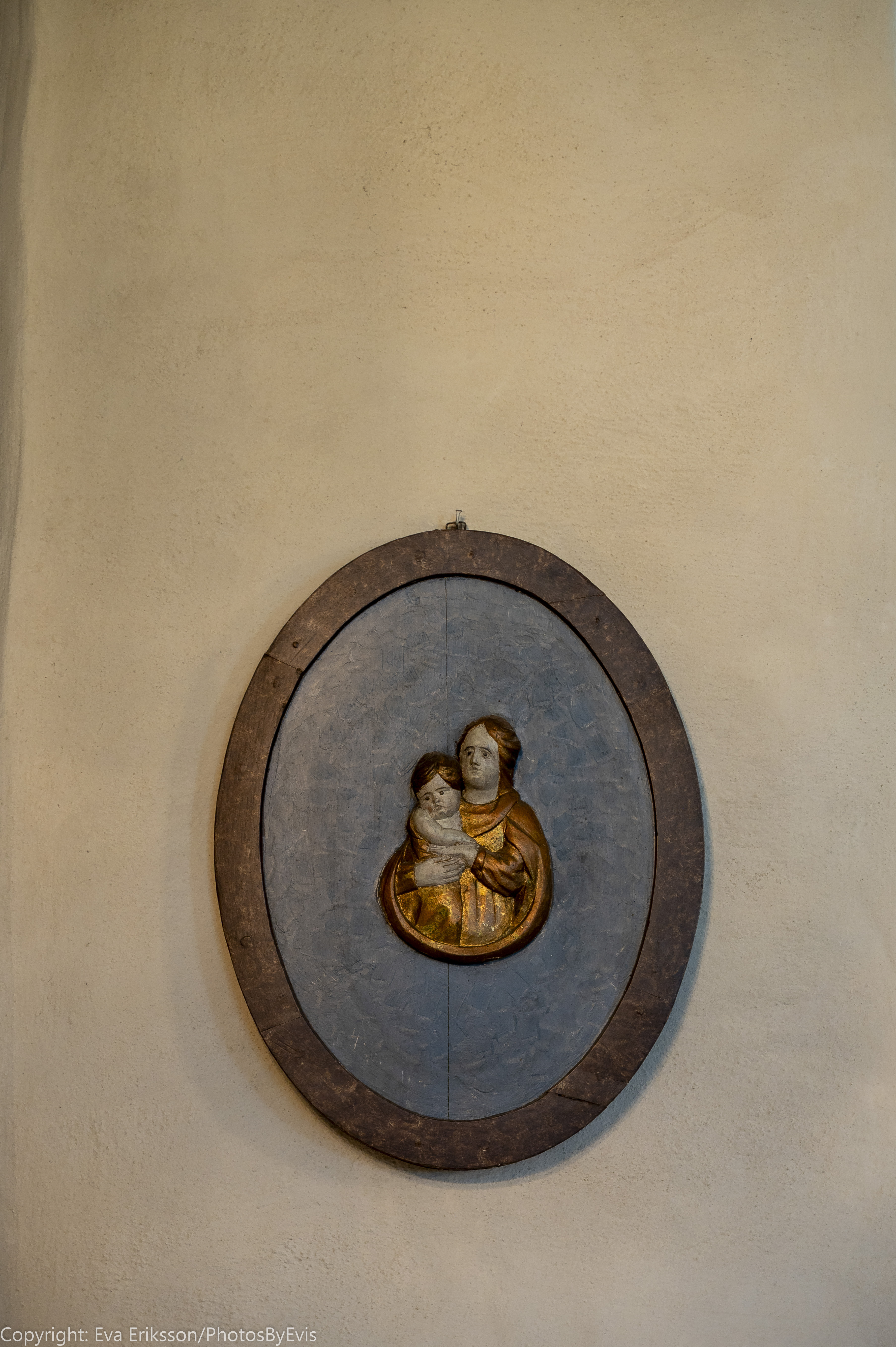 Man tror att kyrkan kan vara helgad åt S.t Mikael och skulpturen var troligen placerad på ett sidoaltare på högra sidan (manssidan) och jungfru Maria skulpturen på ett sidoaltare på den vänstra sidan (kvinnosidan).