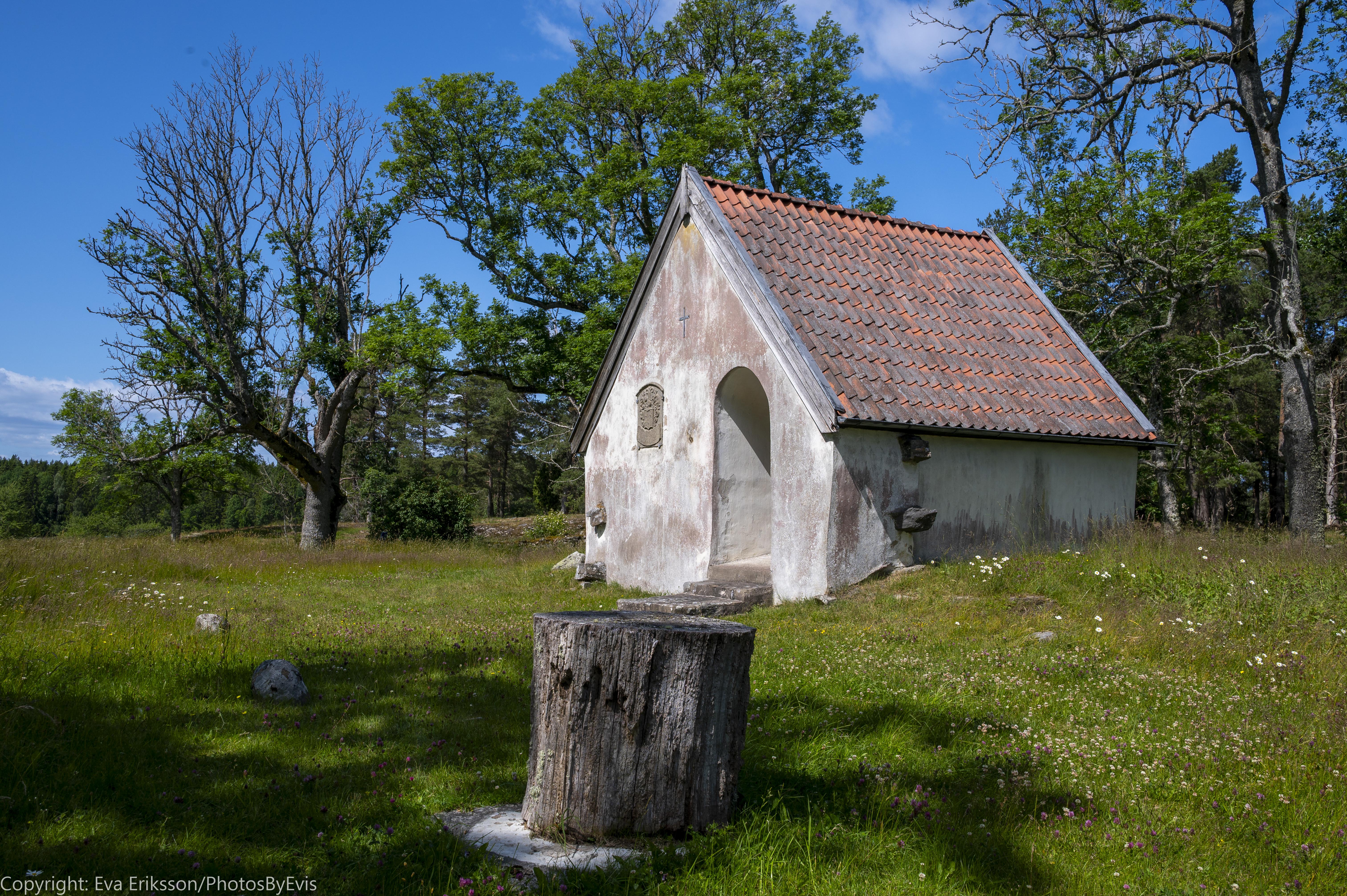 Framför gravkoret står en kubbe och denna kubbe används som altare när det firas gudstjänst här. Så ja, området används fortfarande och det tycker jag är väldigt trevligt! Kubben kommer från en gammal ek som växte på Senäte gård.