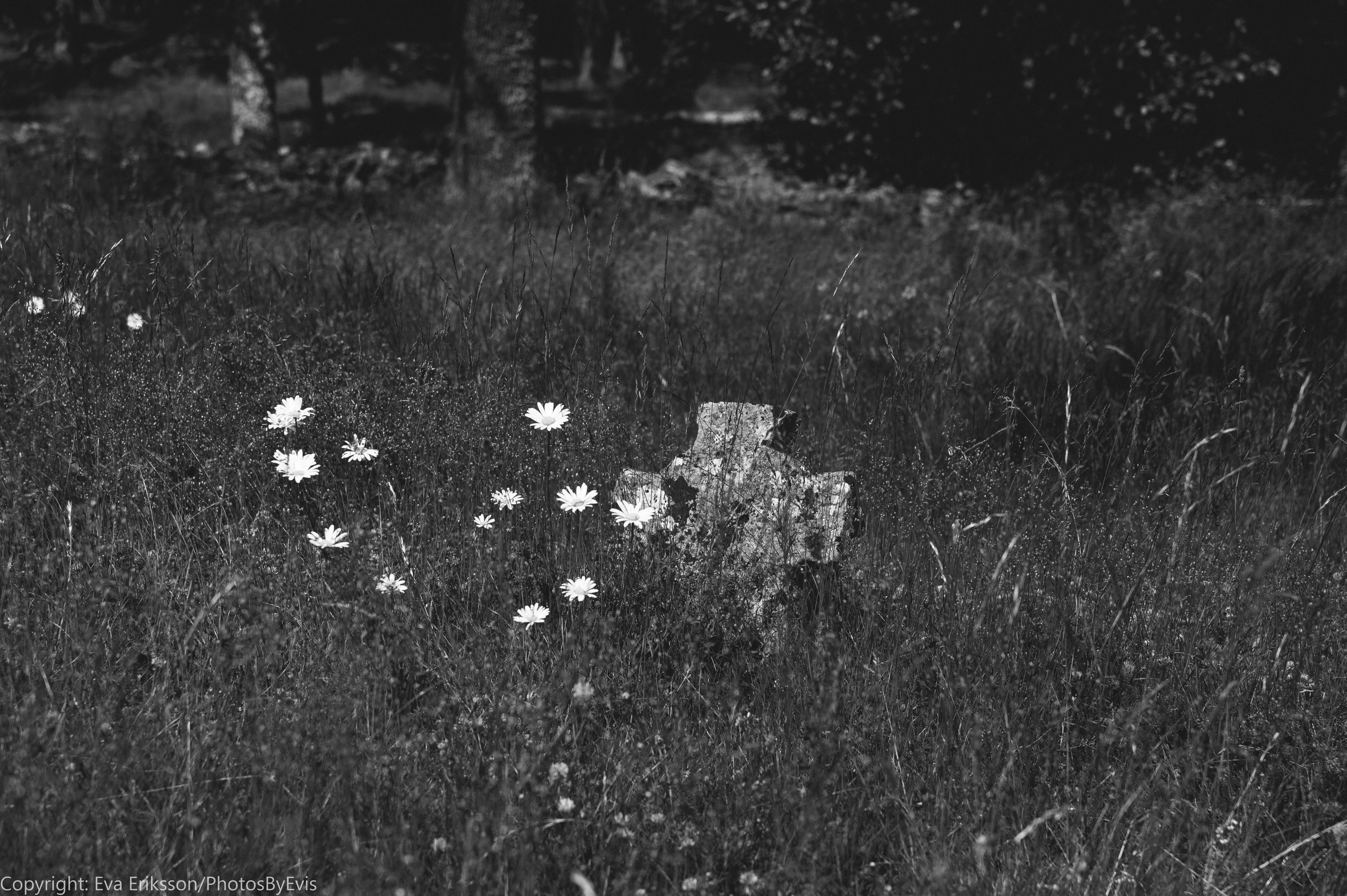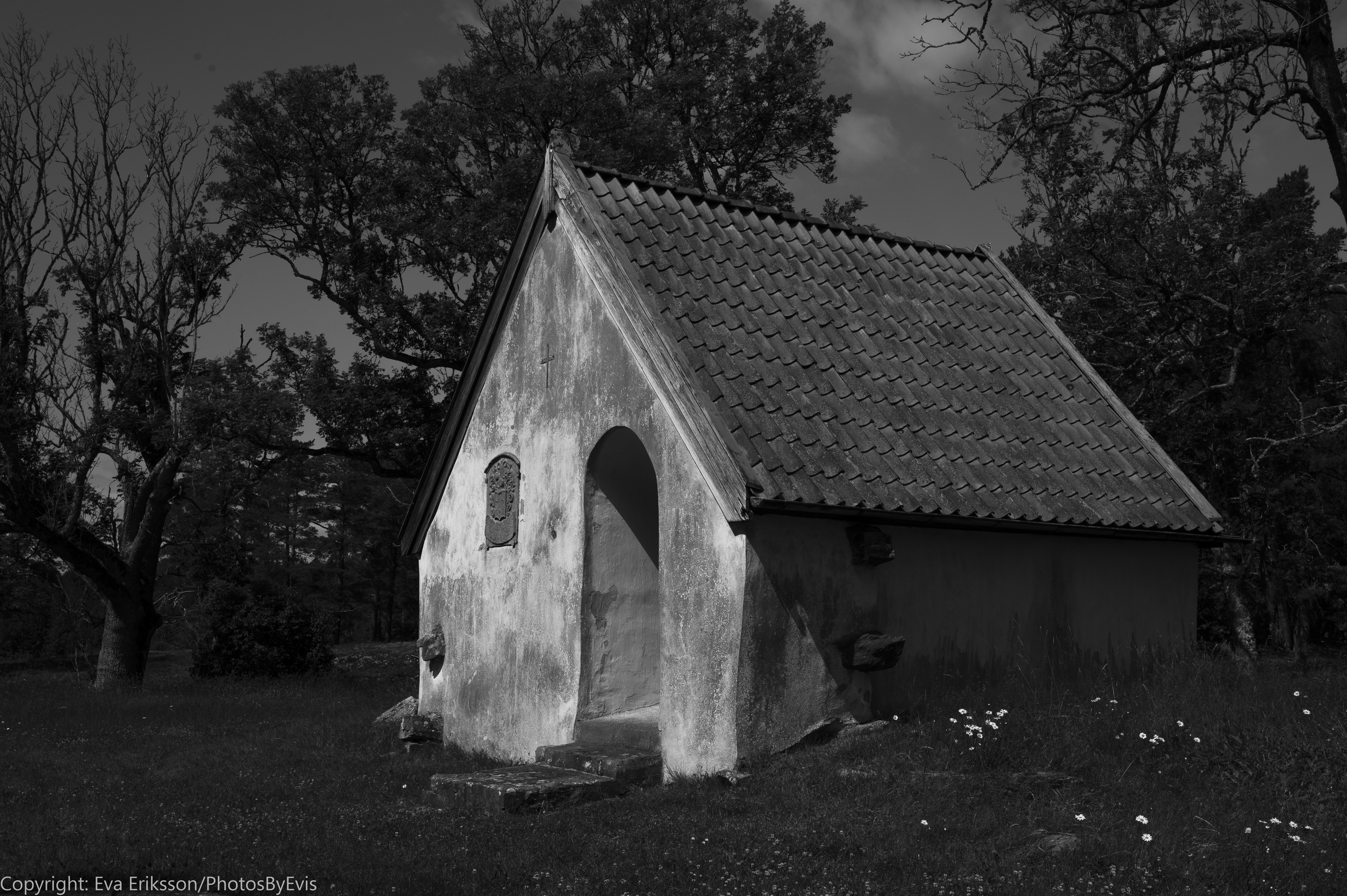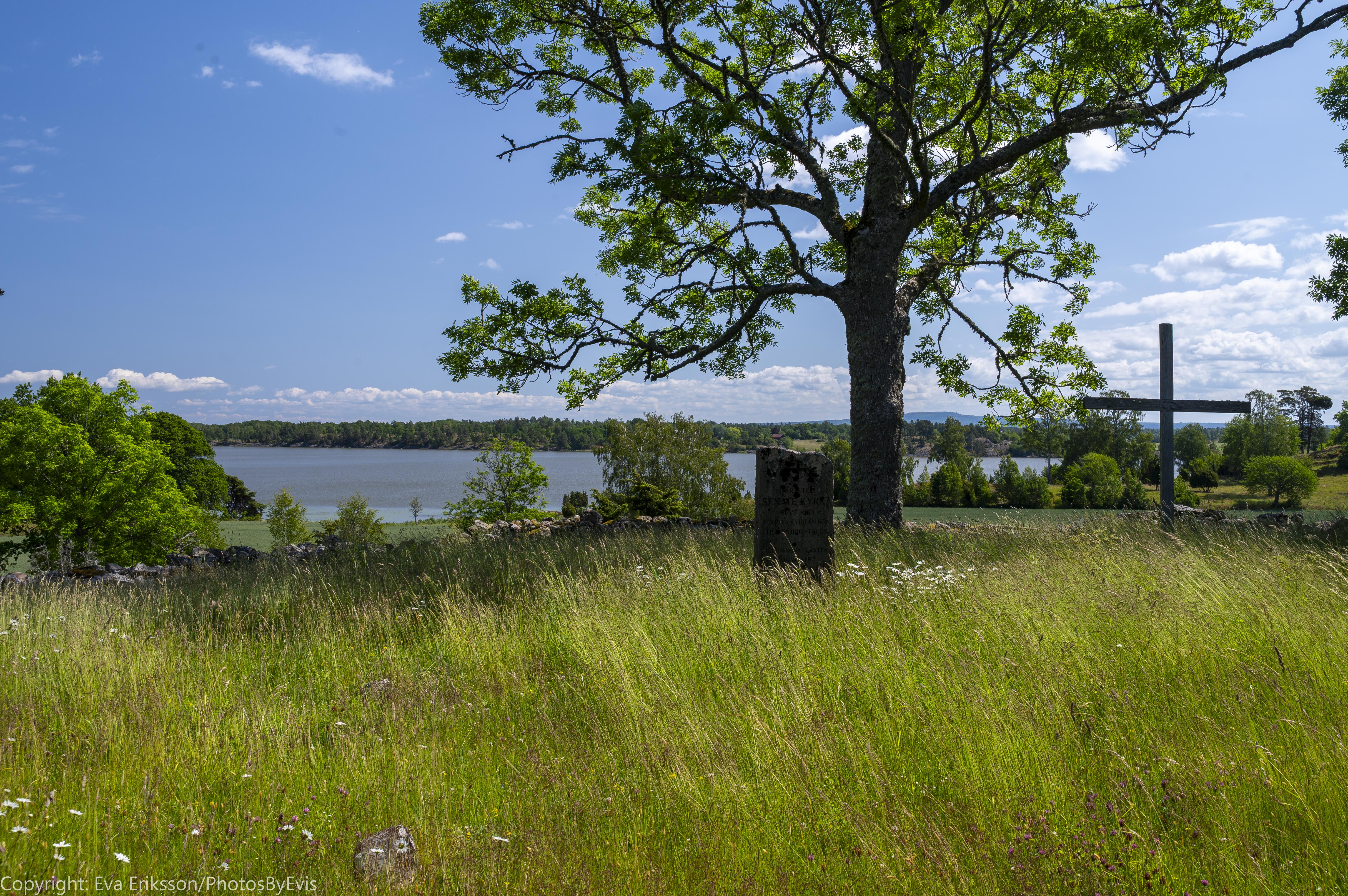 Utöver gravkoret finns det några spridda gravstenar i det -vid det tillfället- höga gräset, en minnessten och ett nutida träkors. Alla bidrar de till stämningen på sitt sätt. Jag får alltid en lite suggestiv känsla av sådana här platser.