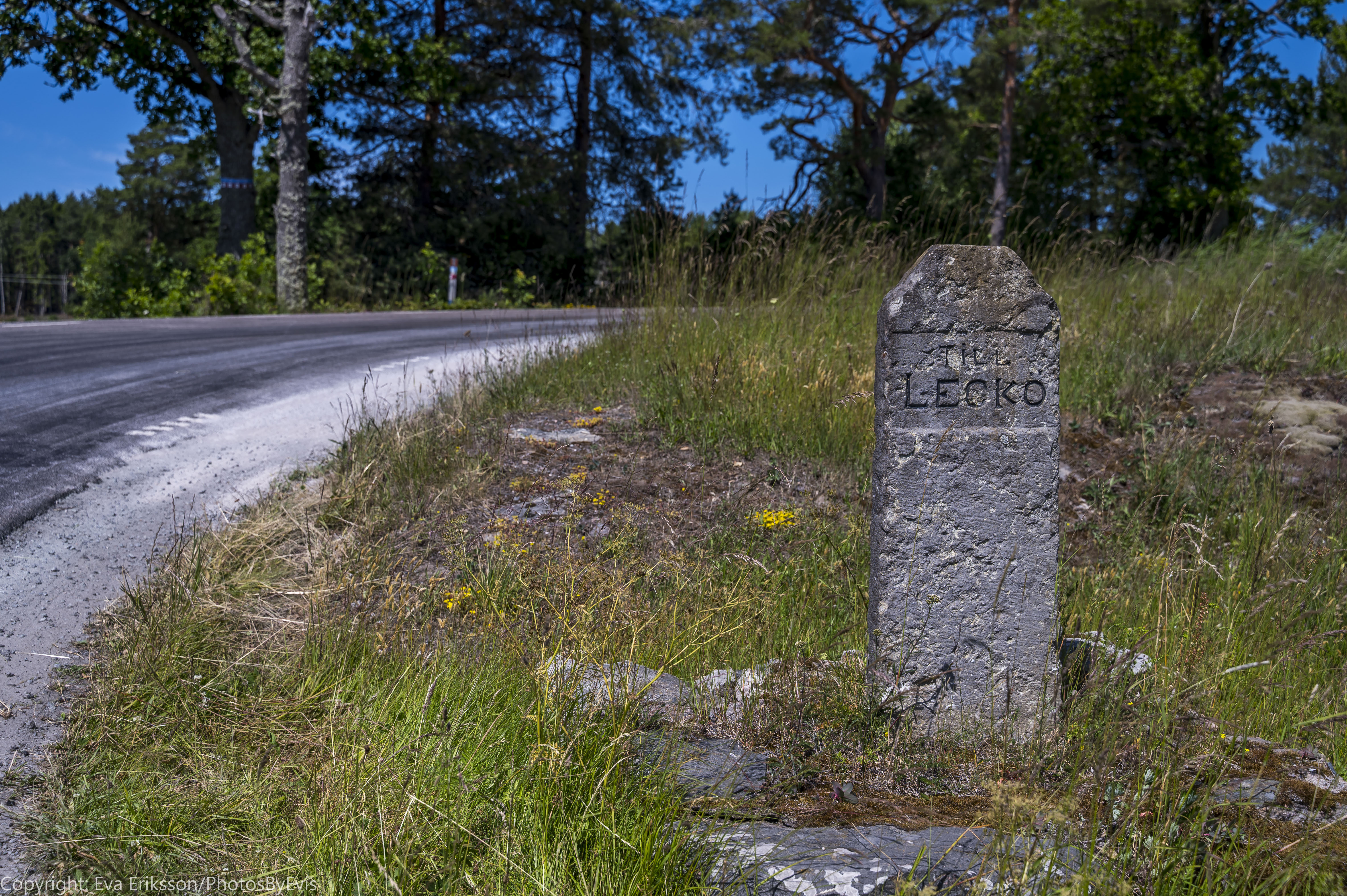 En bit från kyrkoruinen finns en fin gammal vägvisaresten som talar om för oss att där är vägen mot Läckö.